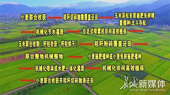 经过一年时间的试验示范,适合深泽县的可复制、可推广的全程机械化解决方案初步形成。即:小麦联合收获机加装秸秆切抛机一次完成小麦收获和小麦秸秆切碎抛撒还田即玉米播种前茬处理作业→大拖及配套玉米免耕深松播种机一次完成免耕深松、开沟、全层施肥、精量播种、镇压复式玉米播种作业→卷盘式节水灌溉设备玉米灌溉作业→四轮驱动四轮转向植保机施药玉米病虫草害防治作业→玉米联合收获机一次完成玉米果穗摘穗、剥皮、收集、秸秆粉碎一遍还田复式玉米收获作业(玉米籽粒收获、烘干、仓储)→大型拖拉机及配套秸秆还田机玉米秸秆粉碎还田的玉米秸秆处理作业→大型拖拉机配套旋耕机整地或大型拖拉机及配套旋耕深松机整地→大型拖拉机配套小麦免耕施肥播种机播种作业。